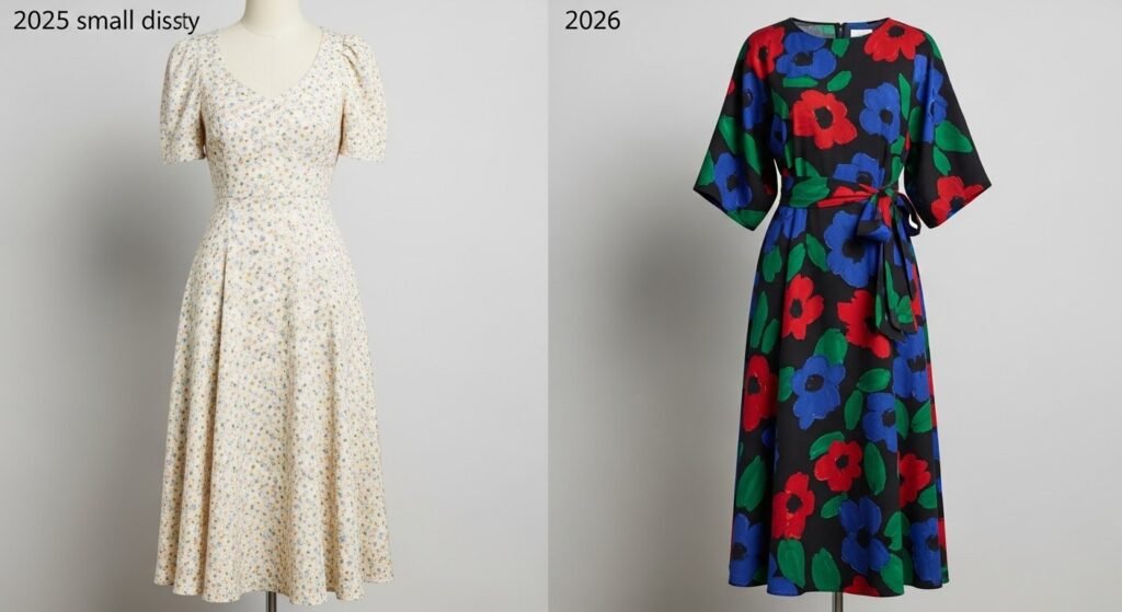 Florals remain dominant, but the 2026 update favors larger, painterly prints on muted backgrounds — watercolor roses on sage green rather than the small ditsy prints of previous years.